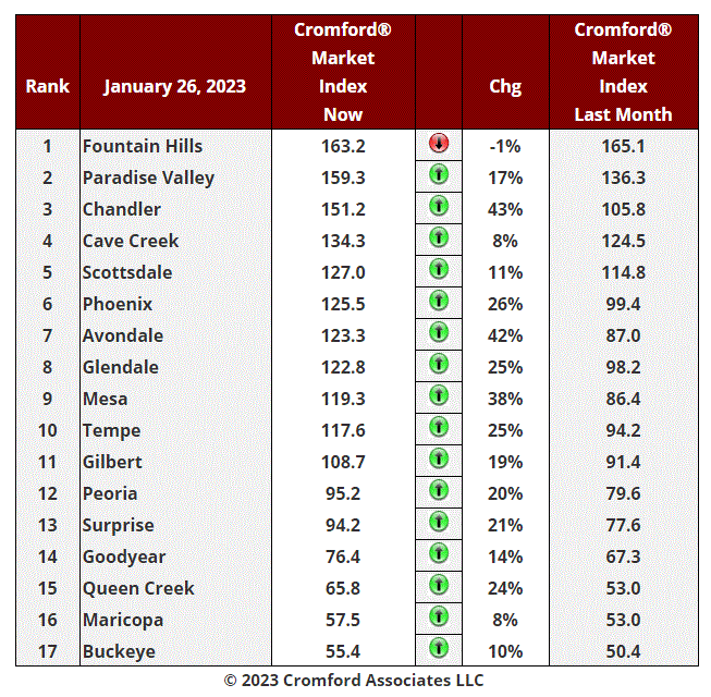 If you notice from the chart above, we still have 10 communities with a CMI over 110, with three communities in the "balanced" territory between 90-110 (Gilbert, Peoria, and Surprise). The rest are in buyers' markets, but on an upward swing (look at Queen Creek up 24%!). According to the Cromford commentary, what's propping up the luxury areas is the fact that sellers are retreating, meaning there is less inventory to meet the demand from buyers. This puts upward pressure on prices that defy the conventional wisdom that would normally apply in the current interest rate environment.