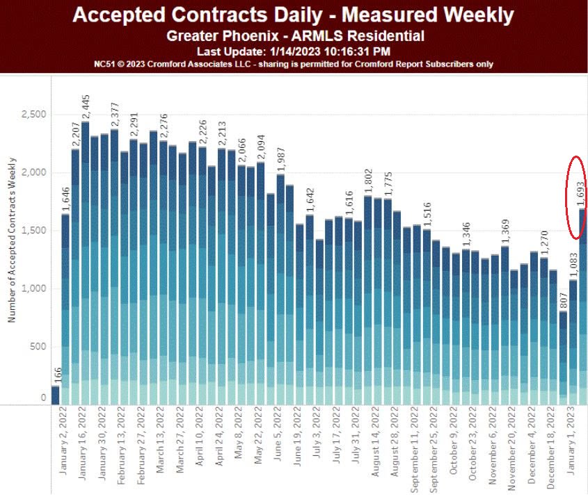 The Cromford Report is a local team of analysts that compile essential real estate data for the entire Phoenix area. There has been some interesting data in recent weeks. It's way too soon to suggest that any of this data says a turnaround is imminent. But it is curious to look at. For instance, coinciding with the easing of interest rates, we have seen a corresponding bump in accepted contracts. The chart below from Cromford demonstrates the bump.